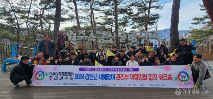 대우여객자동차(주)와 우리버스(주) 대표이사 김익기 외 관리자 40명은 2024년 갑진년 새해맞이 경영혁신 변화를 위한 값진 기업역량강화 워크숍을 1. 19~20일(금,토)1/2일 양일간 강원도 원주시 소금산 일대에서 실시했다고 밝혀왔다.