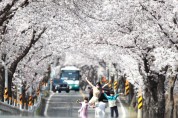 10일 경남 함양군 백전면 50리 벚꽃길을 찾은 상춘객이 만개한 벚꽃을 구경하고 있다.