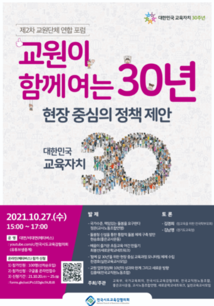 이번 포럼은 협의회가 대한민국 교육자치 30주년 일환으로 학생, 학부모, 청년, 교원, 지역공동체가 참여하는 「교육공동체 토론회」 중 교원 분야로 지난 7월에 이어 교육부, 국가교육회의, 전국시도교육감협의회와 5개 교원단체(전국교직원노동조합, 좋은교사운동, 교사노동조합연맹, 새로운학교네트워크, 실천교육교사모임)가 공동개최했다.