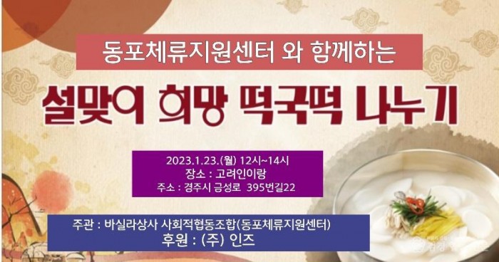 주)인즈 함영필 대표는 지난 23일 바실라상사 사회적 협동조합 동포체류센터에서 2023년 새해를 맞아 타지에서 생활하는 외국인근로자들에게 설맞이 희망 떡국떡 나눔 행사를 개최했다.