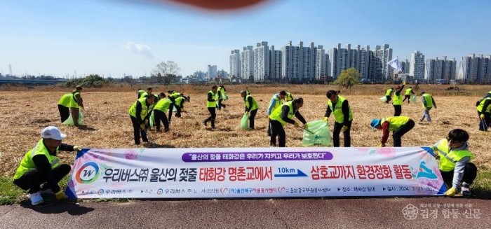 우리버스(주)대표이사 김익기와 노동조합 구운용/지부장외 노, 사 임직원 40여명은 4. 25일 개막하는 울산광역시 전국생활체육대축전을 맞이하여 울산을 찿는 선수단과 관람객을 위해 토요일인 휴무를 반납하고 두 팔을 걷어붙여 울산의 젖줄인 북구, 남구, 중구를 잇는 태화강 일대 10km 환경정화 활동을 3. 23일(토)실시했다고 밝혀왔다.