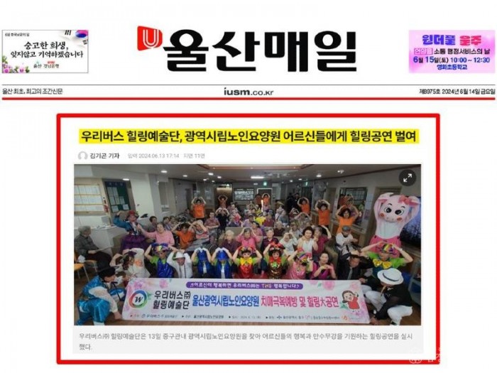 [검경합동신문 이은습 기자] 우리버스(주)힐링예술단은 6. 13일(목) 오전안전 운행을 마치고 중구관내 광역시립노인요양원을 찿아가서 어르신들의 행복을 위해 80여명 모아놓고 악기연주 및 노래, 춤 공연, 장구춤, 마술 등으로 몸과 마음을 함께 희생하며 어르신들께 만수무강 하시라고 마음껏 웃음과 큰절을 선사하고 왔다.