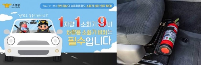 ‘소방시설 설치 및 관리에 관한 법률’ 제11조에 의하면 2024년 12월 1일부터 5인승 이상 모든 차량에도 차량용 소화기를 의무적으로 설치 또는 비치하도록 법이 개정됐다.