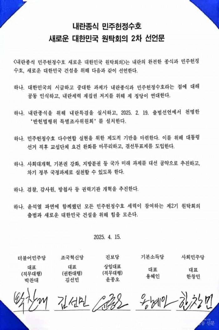 어제(4.15) 더불어민주당 대표 직무대행 박찬대, 조국혁신당 대표 권한대행 김선민, 진보당 상임대표 직무대행 윤종오, 기본소득당 대표 용혜인, 사회민주당 대표 한창민은 ‘내란종식 민주헌정수호 새로운 대한민국 원탁회의 2차 선언문’(이하 2차 선언)을 발표했다. 2차 선언에서 이들 대표는 완전한 내란종식과 민주헌정수호, 새로운 대한민국 건설이 시급하고도 중대한 과제라고 공동 인식하고, 이를 달성하고자 순번을 매기지 않았으나 상호 밀접하게 연관된 6대 과제를 아래와 같이 제시했다.