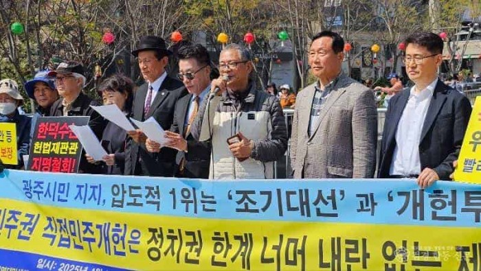 지난 4월 11일 광화문광장 이순신장군 동상 앞에서 ‘국민주권개헌행동’ 등 36개 시민단체가 개헌투표와 조기대선 동시실시를 촉구하는 기자회견을 개최하고 있다.