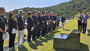 10월 8일 국립대전현충원을 찾은 53개 시민단체 대표단이 홍범도 장군 묘소에서 추모차례를 올린 뒤 기념사진을 찍고 있다(제공 : 공익감시 민권회의). 지난 10월 8일(수) 정오부터 낮 2시까지 약 2시간 동안 ‘개헌개혁행동마당’(상임의장 송운학)에 동참하고 있는 ‘국민주권개헌행동’ 등 50개 시민단체를 중심으로 총 53개 단체 대표단 약 20여 명이 홍범도 장군과 후손 없는 광복군 17위 선열께 순차적으로 추석차례를 올리고 화이부동(和而不同)과 좌우합작 정신 등을 추모한 뒤 “가능한 한 빨리 국권국익수호, 남북평화공...
