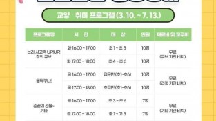 예천군(군수 김학동)은 2월 24일부터 3월 2일까지 청소년수련관1학기 교양‧취미 프로그램과 진로 탐색 및 주말 특강 프로그램 수강생을 선착순 모집한다. 군은 지역 청소년들의 건전한 문화 형성과 자기계발 도모를 위해 교양/취미 프로그램 엔트리로 쉽게 익히는 AI 코딩, 올탁구나! , 논리 사고력 UP! UP! 창의 큐브, 손끝의 선율~기타, 4개 과정을 진행한다. 또한, 더욱 다양한 체험 기회를 제공하기 위해 진로 탐색 프로그램, 집에서 하면 혼나는 과학 실험, 주말 특강 프로그램, 수영의 달인 되기, 2개 과정도...
