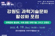 강원도 과학기술문화 활성화 포럼 포스터강원도와 강원과학문화거점센터는 4월 과학의 달을 맞아 오는 19일에 춘천세종호텔 사파이어홀에서 '강원도 과학기술문화 활성화 포럼'을 개최한다. 과학기술정보통신부, 강원도, 한국과학창의재단의 지원을 받아 운영되고 있는 강원과학문화거점센터는 2021년 과학기술정보통신부가 주관한'지역과학문화 활성화 지원'공모사업에 강원연구원이 응모, 선정되어 도내 과학문화 대중화와 지역 간 과학기술문화 수혜 격차 해소를 위한 사업을 추진하고 있다. 특히, 강원과학문화거점센터(센터장 박상용)는 도내 과학문화 인...