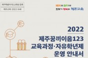 제주도교육청, 2022 제주꿈끼이음123교육과정·자유학년제 운영 안내서 제작·배포제주특별자치도교육청은 2022년 2월 18일 관내 중학교를 대상으로 제주꿈끼이음123교육과정·자유학년제 운영을 돕기 위한 교원 지원용 운영 안내서를 제작·배포하였다. 제주꿈끼이음123교육과정·자유학년제 운영 안내서는‘제주꿈끼이음123교육과정’운영 지원을 위해 학년별 교육과정 운영의 예를 개발·안내하여, 교육과정의 적용 시 학교 현장에서 발생할 수 있는 어려움을 최소화하며, 기존 자유학기(학년)제 운영 관련 매뉴얼을 보완·일원화하여 자유학기-진로연계 교...