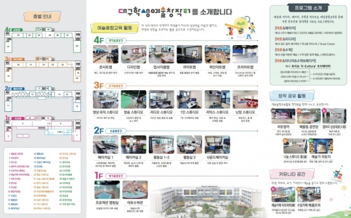 지역 초·중·고등학생을 대상으로 학기 중에는 학교교육과정과 연계한 보편적 예술융합교육을, 방과후 또는 방학 중에는 적성과 진로를 탐색할 수 있는 심화형 맞춤 예술융합교육을 지원하며, 4월부터 7월 중‘우리는 K-컬쳐 크리에이터’를 주제로 첫 문을 여는 프로그램을 운영한다.