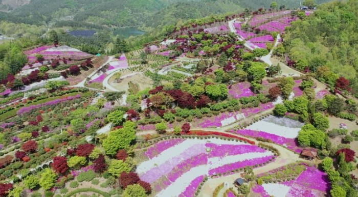 진안군 연장리 꽃잔디 동산이 화려한 꽃 양탄자로 물들었다.