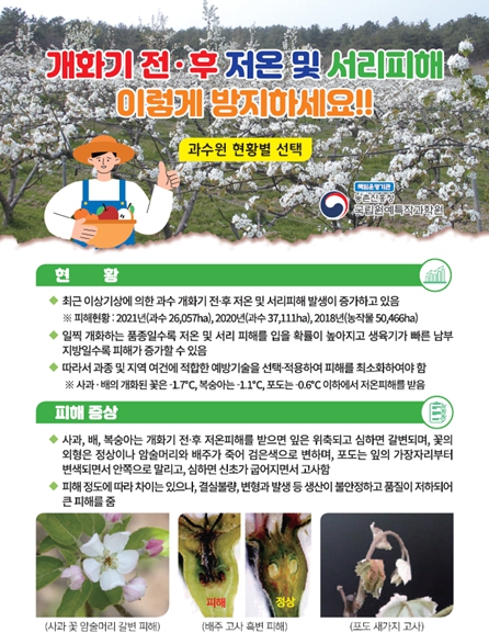 (과수)= 사과, 배 등 과수는 4월 상‧중순경 꽃이 만발하기 때문에 저온으로 꽃이 말라죽는 피해를 최대한 줄여야 상품성 있는 열매를 확보할 수 있다.