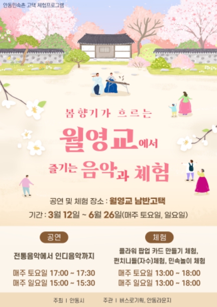 안동시는 3월 12일부터 6월 26일까지 매주 토·일요일 및 공휴일에 안동민속촌 내 남반고택에서 버스킹 음악과 재미있는 체험을 즐길 수 있는 특별한 주말여행 프로그램을 선보인다.