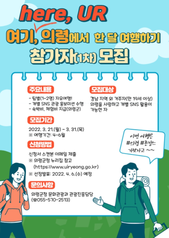 의령군은 올해 ‘here, UR 여기, 의령에서 한 달 여행하기’ 사업 참가자 모집을 이달 21일부터 시작한다고 밝혔다.
