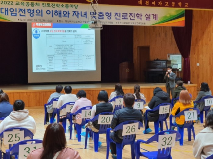 충청남도교육청은 학부모의 진로, 고입, 대입에 관한 궁금증을 해결하고, 자녀 진로 설계를 돕기 위한 ‘교육공동체 진로진학소통마당’을 이달 22일 대천여고를 시작으로 11월 말까지 실시한다고 밝혔다.
