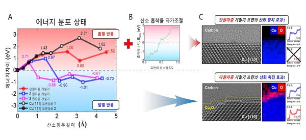 또한, 산소가 구리 내부로 들어가기 위한 에너지 변화를 계산한 결과, 표면 거칠기가 두 원자 층 이상일 경우 구리 내부로의 산소 침투가 쉽게 진행되는 반면, 완벽하게 평평한 면 이거나 단원자층 일 때는 산소 침투를 위해 매우 큰 에너지가 필요하기 때문에 상온에서는 산화가 일어나지 않음을 밝혔다.