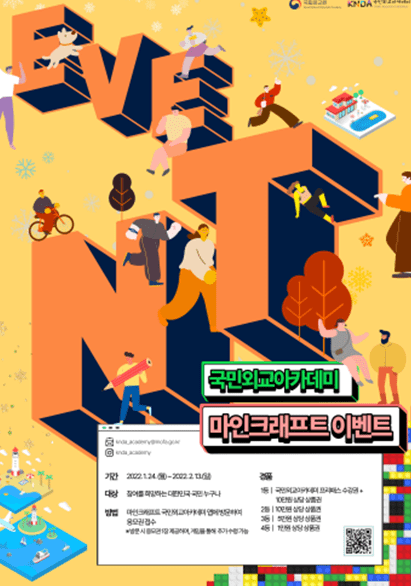 외교부 국립외교원은 1.25.부터 2.14.까지 유명 게임인 ‘마인크래프트’를 활용하여 대국민 외교 교육과정인 '국민외교아카데미'에 대한 24시간 가상공간 체험 프로그램을 운영한다.