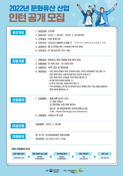 문화재청과 한국문화재재단은 문화유산 산업분야 취업 확대를 위한 경력을 지원하기 위해 1월 28일부터 2월 20일까지 한국문화재재단 누리집을 통해 문화유산 산업 청년 인턴을 공모한다.