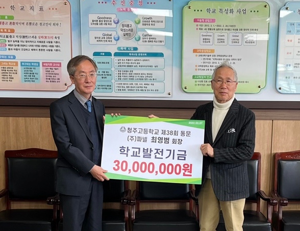 충청북도교육청 청주고등학교 제38회 동문이며 ㈜파넬 최영범 회장이 7일 모교를 방문하여 학교발전기금 3천만원을 기탁했다.