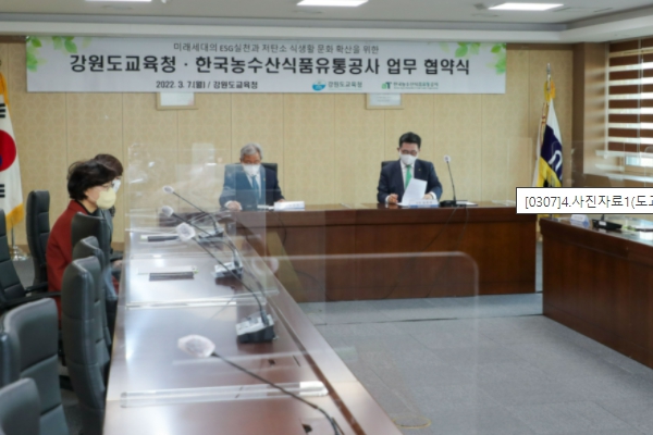 강원도교육청은 7일, 도교육청 2층 소회의실에서 한국농수산식품유통공사와 미래세대의 ESG 실천과 저탄소 식생활 문화 확산을 위한 업무협약을 체결한다.