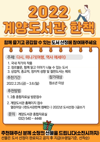 인천시교육청계양도서관은 시민의 도서 추천을 시작으로 '2022 한 도서관 한 책 캠페인' 사업을 추진한다.