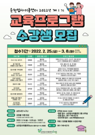 순천시는 업사이클 문화 확산과 시민의식 함양을 위해 ‘순천업사이클센터 더새롬’에서 버려지는 자원의 새활용과 재활용 활성화를 주제로 2022년 제1기 교육프로그램을 운영한다.