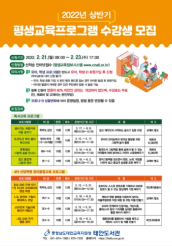충청남도태안교육지원청태안도서관은 상반기 평생교육프로그램 '글쓰기는 처음이라 처음글쓰기' 등 학부모, 유아, 학생 대상 8개 강좌의 수강생을 21일부터 23일까지 모집한다.