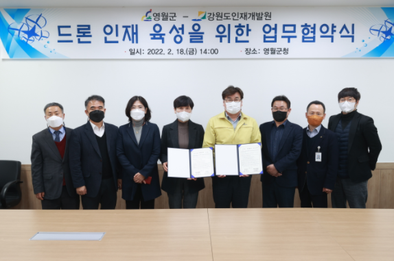 영월군은 18일 강원도 인재개발원과 드론산업 발전을 위한 미래인재 육성 업무협약(MOU)을 체결했다. 이번 업무협약을 통해서 강원도 인재개발원에서 진행하던 공직자 드론교육과정을 교육을 2022년 부터 영월군 내에서 진행한다.
