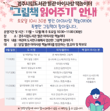 경주시립도서관은 11월을 맞아 코로나19로 인해 중단됐던 그림책 읽어주기 활동을 별관 아이사랑 책놀이터에서 재개한다고 1일 밝혔다.