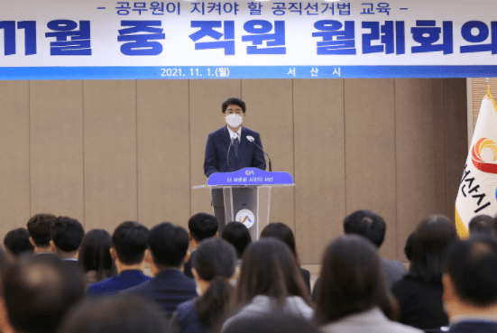 1일 시청 대회의실에서 열린 11월 직원 월례회의 모습, 맹정호 서산시장이 1일 시청 대회의실에서 직원들에게 당부사항을 전달하는 모습