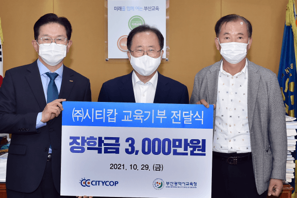 부산광역시교육청은 10월 29일 오후 2시 30분 교육감실에서 (주)시티캅으로부터 저소득층 가정 학생을 위한 교육기부금 3,000만원을 전달받았다.