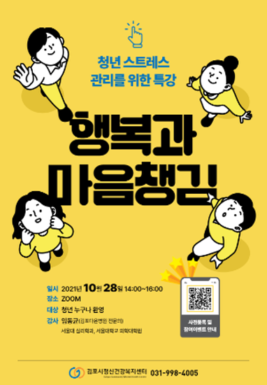 김포시정신건강복지센터는 지난, 10월 28일 관내 청년 100여명을 대상으로 스트레스 관리 ‘행복과 마음챙김’이라는 주제로 비대면 강의를 진행하여 큰 호응을 받았다.