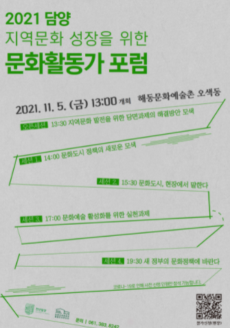 담양군문화재단은 다음 달 5일 ‘지역문화 성장을 위한 문화활동가 포럼’을 개최한다고 밝혔다.