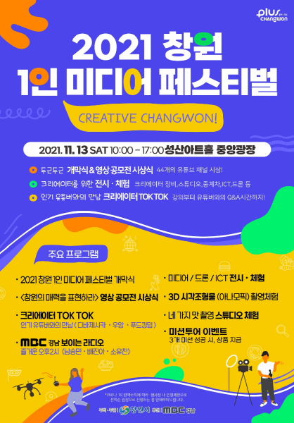 4차 산업을 대표하는 1인 미디어 산업을 주제로 올해 처음 진행하는 이번 행사는 창원시가 주최/주관하고, MBC 경남이 후원한다. 개회식과 영상공모전 시상식을 시작으로 인기 유튜버와의 만남, 미디어 장비 전시, 체험 등 1인 미디어의 세계를 생생히 체감할 수 있도록 준비된다.