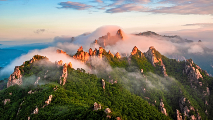 안충호 : 설악의 아침, 여름 설악산공룡능선에 아름다운 일출빛이 공룡의 머리위에 내려앉아 신비로움을 더해 주고 있다