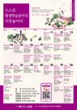 오산시는 이웃과 함께하는 평생학습동아리를 소개하고, 오산시에서 활동하는 평생학습동아리를 활성화하기 위해 오는 11월 11일부터 24일까지 ‘스스로 평생학습동아리 이웃놀이터’를 진행한다고 29일 밝혔다.
