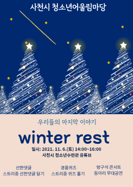 사천시 복지청소년재단의 소속인 청소년수련관이 오는 11월 6일 ‘윈터레스트’ 유튜브 방송(청소년어울림마당)’으로 사천시민과 청소년들을 만난다.