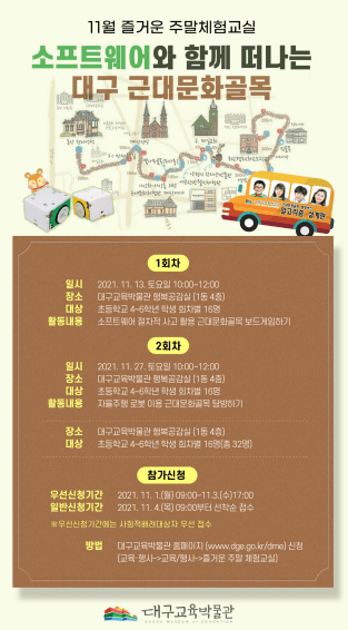 대구교육박물관은 지역의 초등학생을 대상으로 역사 문화 체험의 기회를 제공하기 위해 11월 13일과 11월 27일 각 10시부터 12시까지 운영하는 ‘11월 즐거운 주말체험교실’의 참가 신청을 11월 1일 9시부터 11월 3일 17시까지 사회적배려대상자 대상 우선 신청, 11월 4일 9시부터 일반 신청을 대구교육박물관 홈페이지을 통해 접수한다.