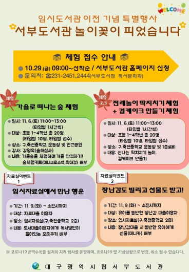 대구서부도서관은 내부 리모델링 공사로 죽전중학교 폐교에서 운영하는 임시도서관 홍보 및 이용 활성화, 다양한 체험기회 제공을 통한 책읽는 문화 확산을 위해 11월 6일 ‘서부도서관 놀이꽃이 피었습니다’체험행사를 운영하고 참가신청을 서부도서관 홈페이지를 통해 10월 29일부터 접수한다.