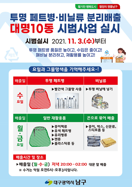 대구광역시 남구청은 환경부 지침개정에 따른 단독주택지역 투명페트병 별도 분리배출 의무화(‘21.12.25.) 시행에 앞서 대구시 추진 「투명페트병, 비닐류 분리배출 요일제」를 11월부터 시범 추진한다.