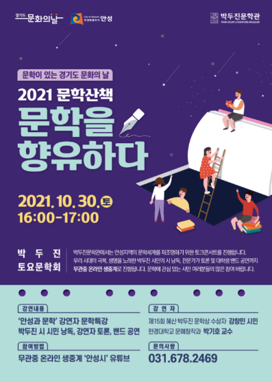 안성시 박두진문학관은 경기도 문화의 날을 맞아 온라인 생중계 토크콘서트 「2021 문학산책: 문학을 향유하다」를 오는 30일 오후 4시에 진행한다고 밝혔다.