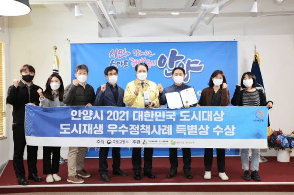 28일 안양시청 대회의실, 안양8동 명학마을 도시재생 뉴딜사업으로 이달 21일‘2021년도 대한민국 도시대상 우수정책 부문 특별상에 선정된데 따른 자체 시상식이 진행됐다.