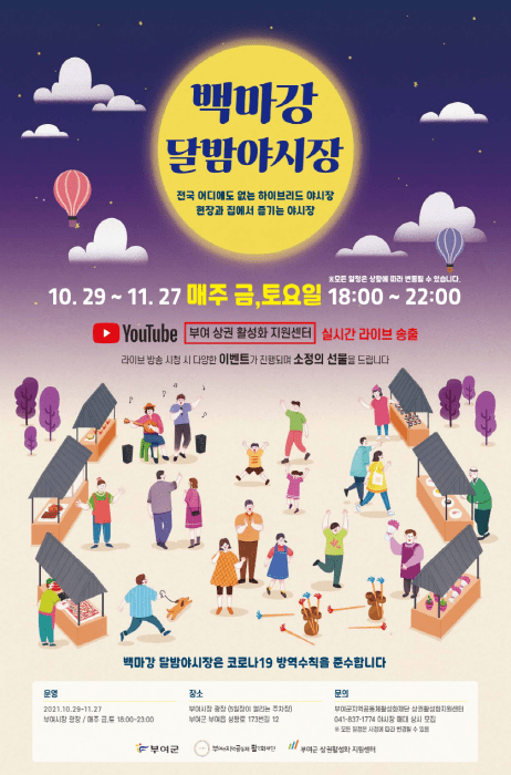 이번 백마강 달밤야시장 시범 운영은 마스크 착용, 거리두기, 방문객 콜체크인 등 코로나19 방역지침을 준수하는 가운데 진행되며, 부여군상권활성화지원센터 유튜브 채널을 통해 생중계 된다.