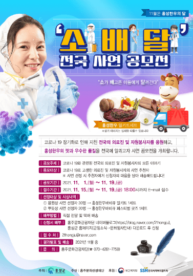 홍주문화관광재단은 코로나19 장기화로 지친 의료진과 자원봉사자들을 위로하고 홍성한우의 우수한 품질과 맛을 알리고자 오는 11월 1일부터 19일까지 사랑과 나눔의 의미를 담은‘소(가) 배(고픈 이들에게) 달(려간다) 공모전’을 개최한다.
