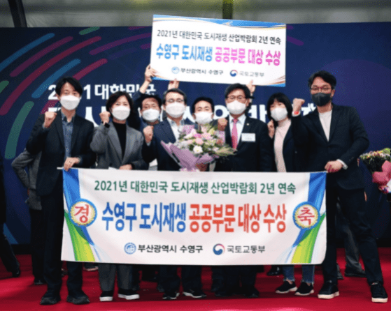 부산광역시 수영구는 국토교통부와 문화일보가 공동주최하고 10. 27.~10. 30. 창원시 마산해양신도시 일대에서 진행되는 2021년 대한민국 도시재생 산업박람회 대상에서 공공부문 국토교통부장관상을 받았다고 밝혔다.