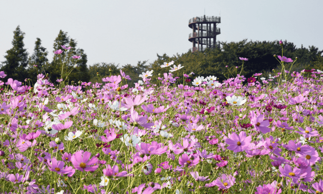 경기도 유일의 내만 갯골과 옛 염전의 정취를 느낄 수 있는 아름다운 곳, 시흥시 연성동 동서로 287에 위치한 갯골 생태공원이 강렬한 햇빛 푸른하늘 사이로 코스모스, 댑싸리밭, 분홍빛 핑크뮬리로 가득차 있고, 시민들은 코로나19 확산 방지를 위하여 마스크 착용과 거리두기 실천으로 산책하고 있다.