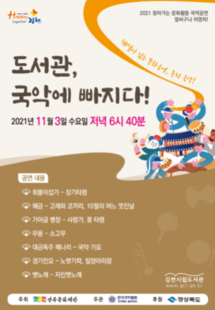 김천시립도서관에서는 오는 11월 3일, 해설이 함께 하는 국악 공연「도서관, 국악에 빠지다!」를 개최한다고 밝혔다.