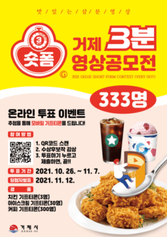 거제시는 ‘2021 거제시 3분 숏폼 영상 공모전’의 최종 수상작 선정을 위해 1차 심사를 통과한 수상후보작 14편의 작품에 대한 2차 심사를 지난 26일부터 오는 11월 7일(일)까지 진행한다고 밝혔다.
