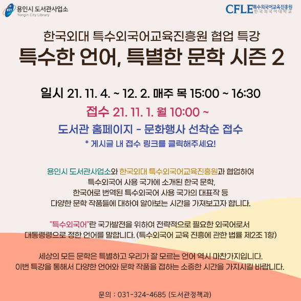 용인시 도서관사업소가 다음달 4일부터 12월 2일까지 온라인 인문학 강연 ‘특수한 언어, 특별한 문학’의 시즌2를 진행한다.