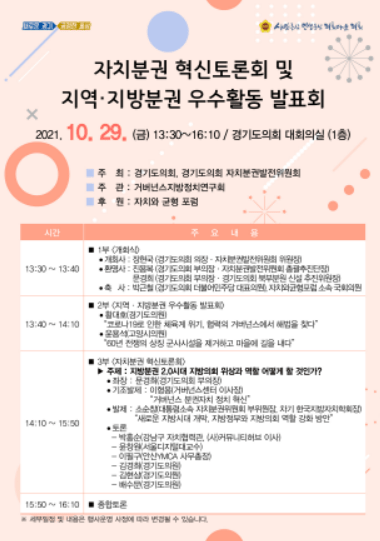 경기도의회는 자치분권 혁신토론회 및 지역․지방분권 우수활동 발표회가 10월 29일 금요일 오후 1시 30분 경기도의회 대회의실에서 개최된다고 밝혔다.